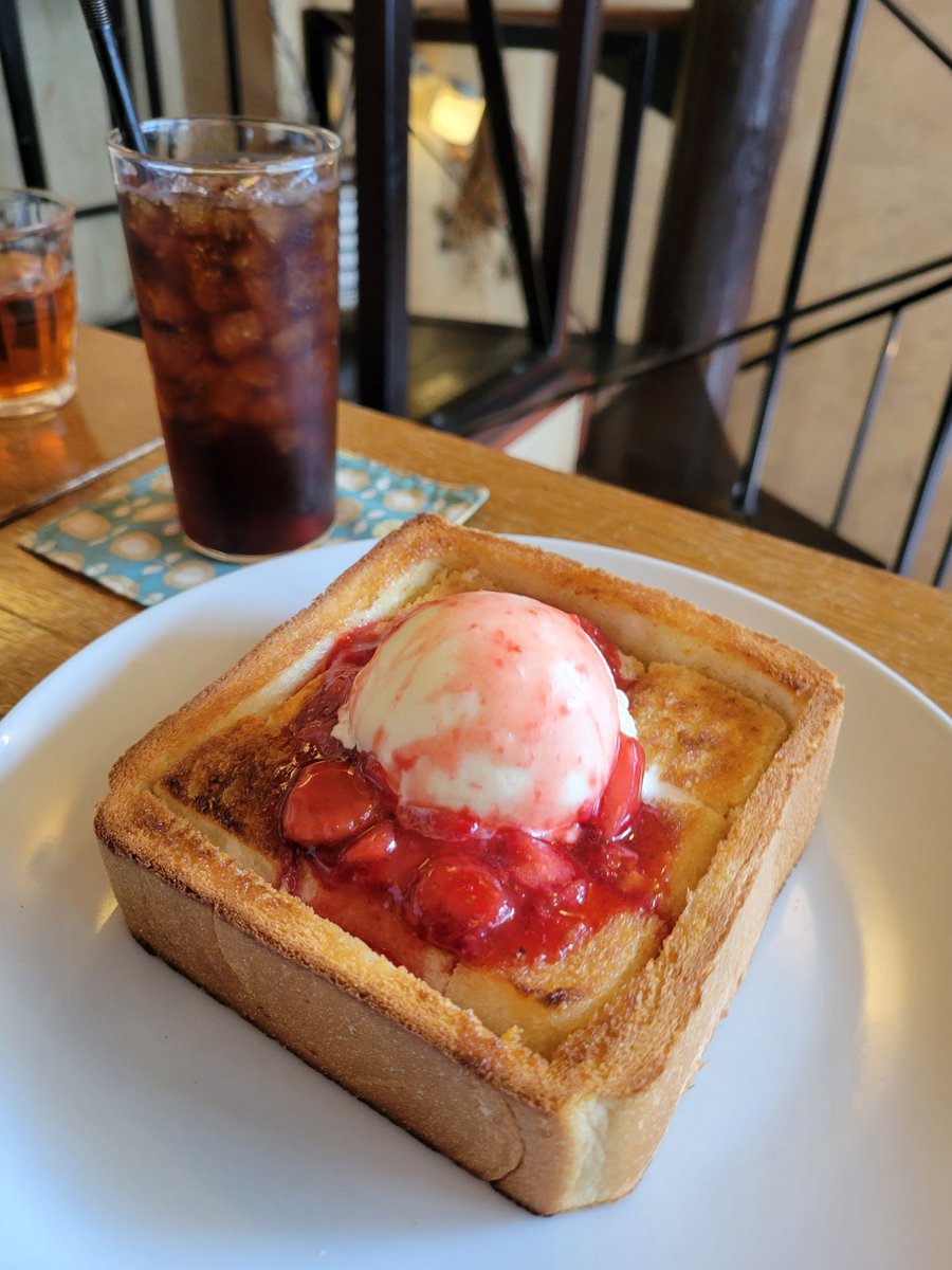 RT @g_for_student: 店名・Caffè LouieLouie /ルイルイ 場所・新京極商店街 ▪️ストロベリートースト&珈琲 「映画館の近くにある青い店」という印象が強い 海外の人が口を揃えて言う 「ここの珈琲やエスプレッソは旨い」 分厚いトーストに苺ジャムとアイスを絡めてめしあがれ😊 煙草もOK